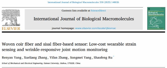 近日,海南大学机电工程学院汝绍锋副教授团队在基于天然植物纤维的低成本、环保型柔性传感器研究方面取得重要进展。相关研究成果先后发表在国际期刊《International Journal of Biological Macromolecules》(IF 8.5)和《Chemical Engineering Journal》(IF 13.2)上。